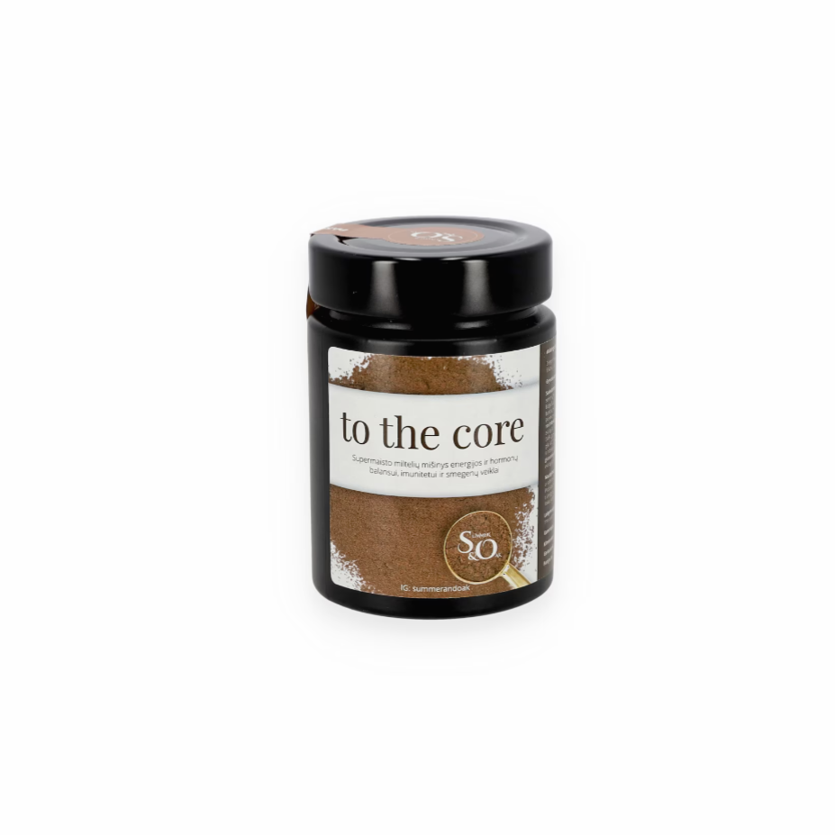 Supermaisto mišinys imunitetui, energijos ir hormonų balansui To The Core Augalų sėklų, žolelių, šaknų, grybų, uogų, vaisių ir prieskonių mišinys su L-karnitinu, GABA, MSM ir MCT aktyviosiomis medžiagomis energijos balansui, protinei veiklai, fizinei ištvermei, imuniteto stiprinimui ir bendros savijautos gerinimui per mitybos praturtinimą ir organizmui palankių įpročių formavimą. Šis adaptogenų mišinys gali padėti organizmui atremti trumpalaikį ir ilgalaikį, fizinį ir psichologinį stresą, įveikti nuovargį, skatinti metabolizmą.